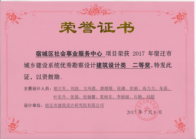 1、宿城區(qū)社會事業(yè)服務(wù)中心項(xiàng)目中獲建筑設(shè)計(jì)類二等獎(jiǎng)