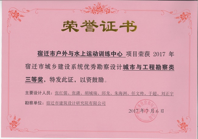 2、宿遷市戶外與水上運(yùn)動訓(xùn)練中心項(xiàng)目中獲城市與工程勘察類三等獎(jiǎng)